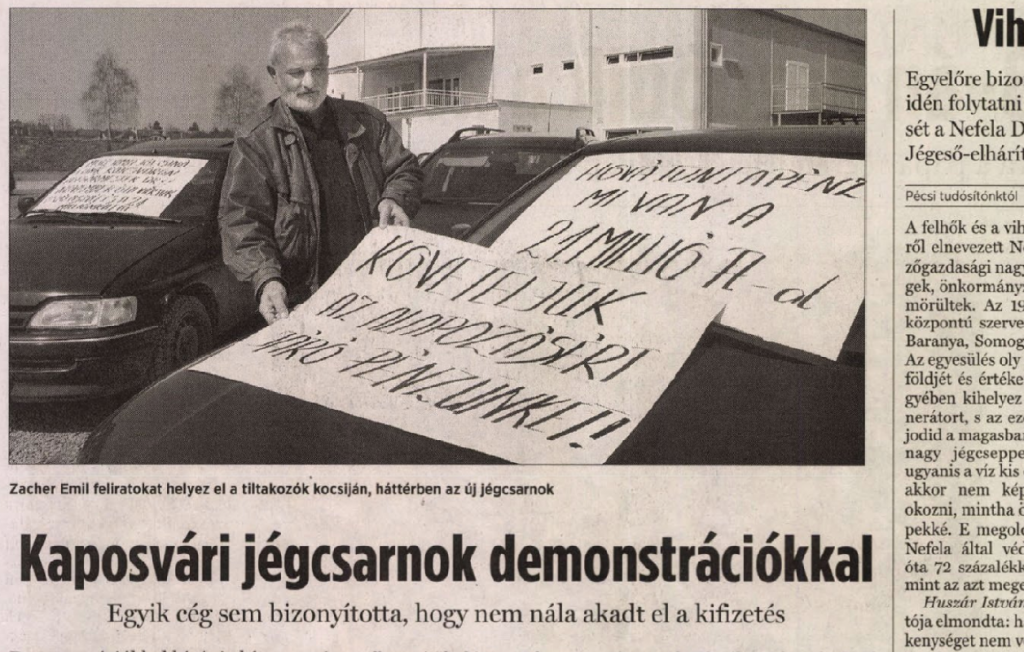 A kaposvári jégcsarnok építési munkálataiban részt vevő Z-2004 Kft. vezetője, Zacher Emil több neki dolgozó alvállakozóval közösen kezdett demonstrációba a jégcsarnok átadása idején. Ugyanis, bár az alapozási munkákat elvégezték, a jégcsarnok elkészültéig nem kapták meg a nekik járó pénzt a beruházótól. A vállalkozók megpróbálták megzavarni a jégcsarnok nyitóünnepségét is, ezt azonban többszöri időpontmódosítással elkerülték a […]