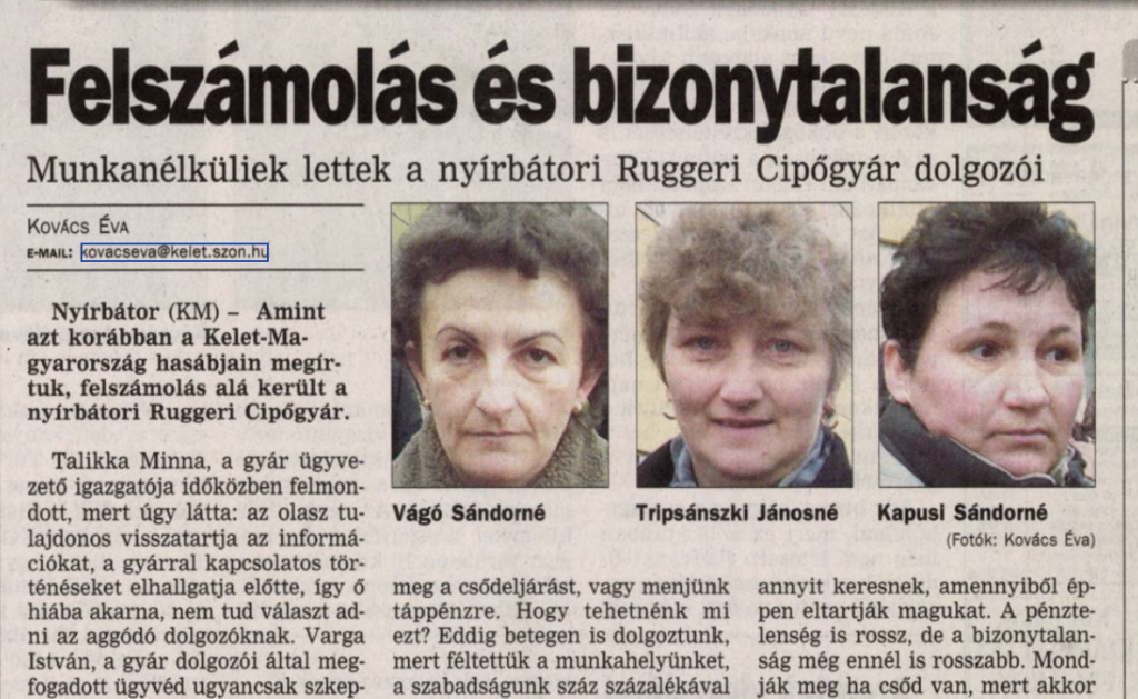 A nyírbátori Ruggeri cipőgyár mintegy száz dolgozója tiltakozott a gyár előtt, mert nem fizették ki a nekik járó több havi munkabérüket. A gyár mintegy 400 dolgozónak adott munkát és egészen tavalyig sikeresen működött, azonban időközben az olasz tulajdonos tönkrement, és a gyár felszámolás alá került. A dolgozók, akiknek november eleje óta nem biztosítottak munkát, azt […]